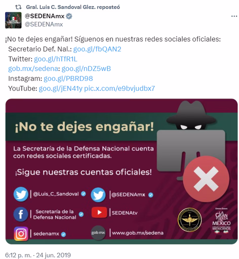La Sedena, a través de su Oficina de Comunicación Social, informó que el general Luis Cresencio Sandoval cerró sus cuentas en redes sociales en 2023 y actualmente no tiene perfiles activos en plataformas digitales. Estos mensajes publicados en X (antes Twitter) fueron atribuidos a una cuenta apócrifa.